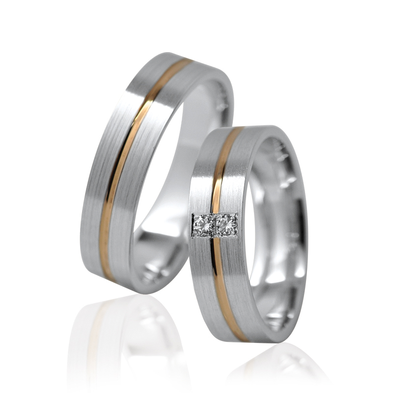 Dominantou tohoto snubního prstenu je něžná drážka z červeného zlata, která k sobě pojí dvě poloviny prstenu, stejně jako k sobě sňatek pojí dva životy. V dámském snubním prstenu jsou navíc hýčkány dva kameny, sedící vedle sebe bok po boku, jako správný manželský pár.